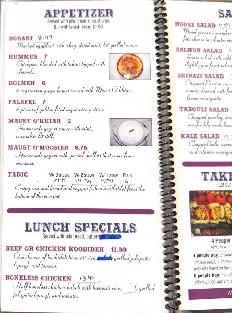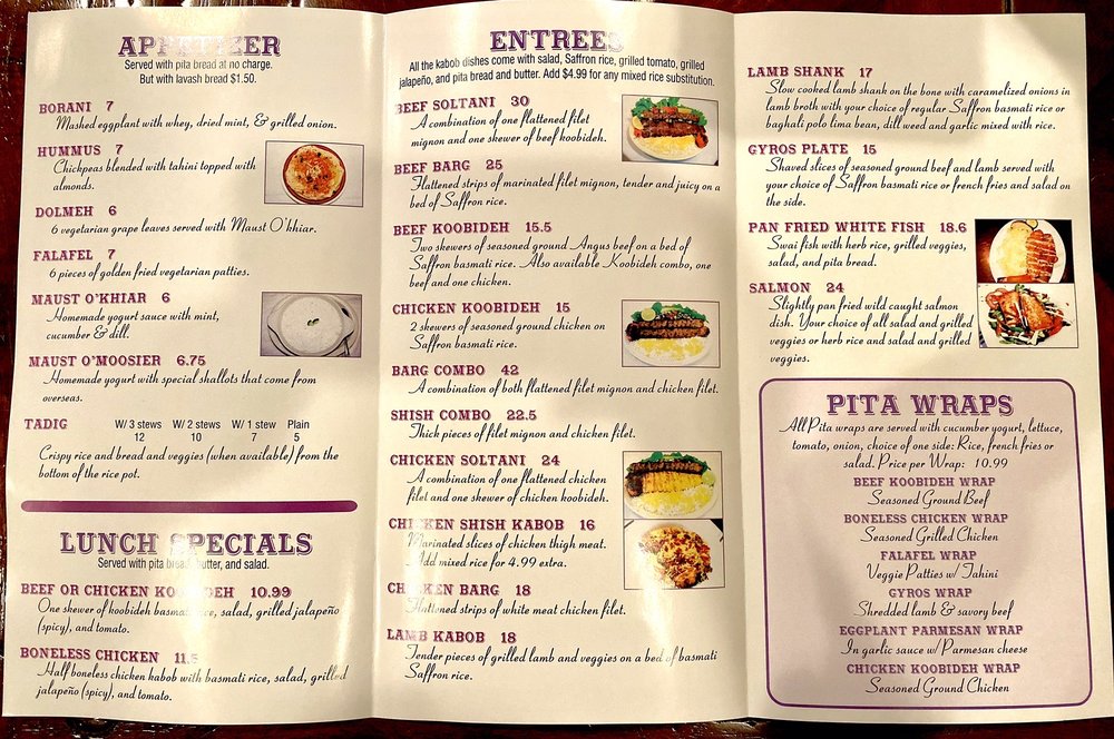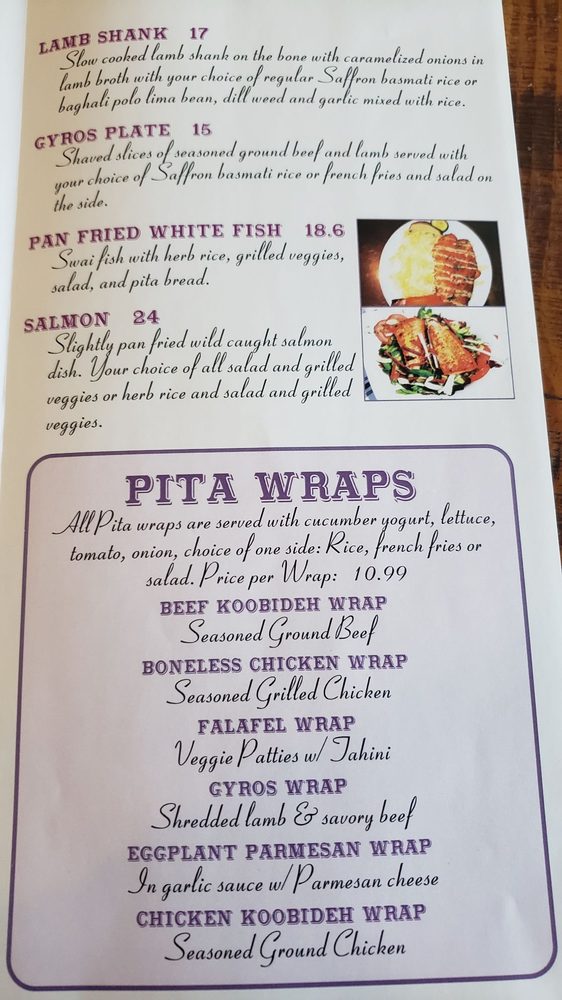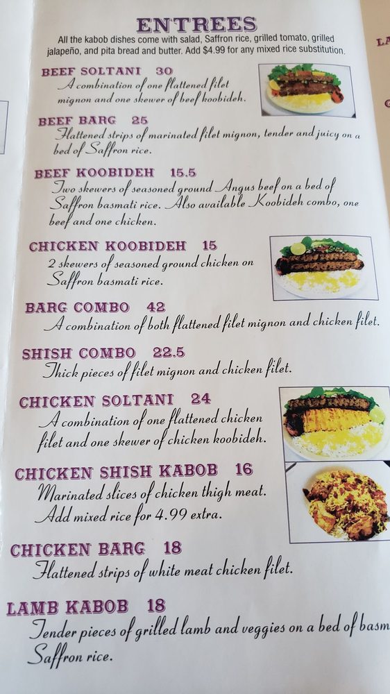 The menu offers a variety of enticing appetizers, such as Hummus and Falafel, alongside delectable salads like the Shirazi Salad. Don’t miss the traditional Ash Reshteh soup, a warm embrace of flavors with a unique vegetarian twist. For those who enjoy a heartier meal, the Chicken House Salad and fresh fish options ensure there's something for everyone.